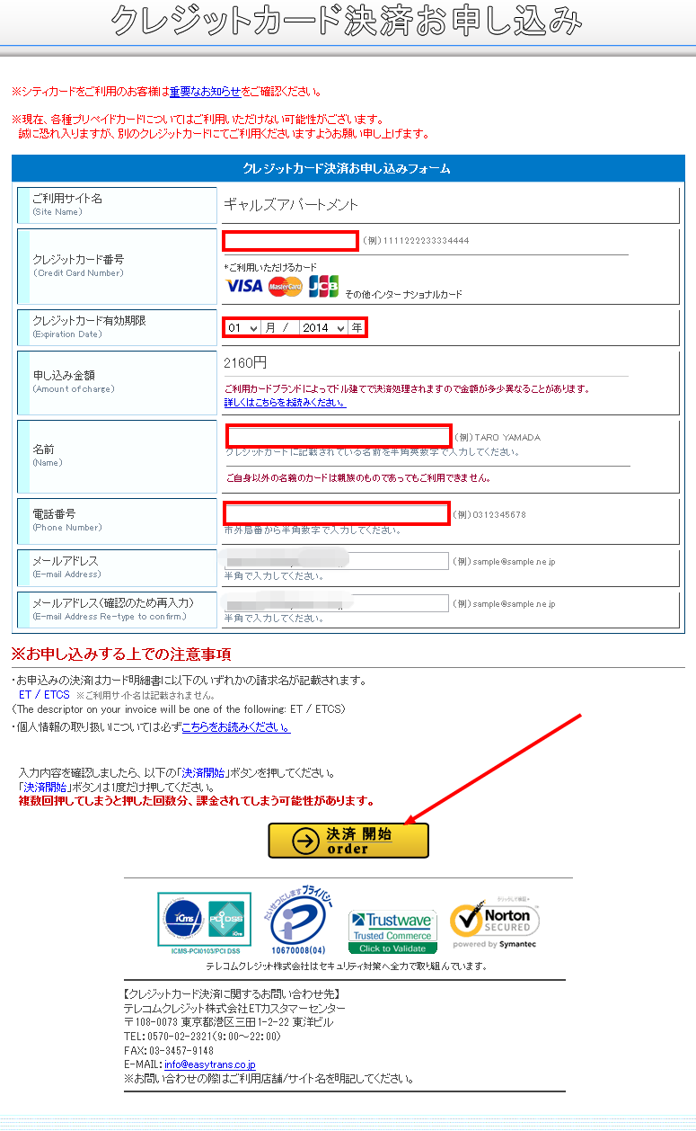 クレジットカードの情報を入力します。電話番号は確認のために必要なので、ギャルズアパートメントからかかってくるといったことはありません。